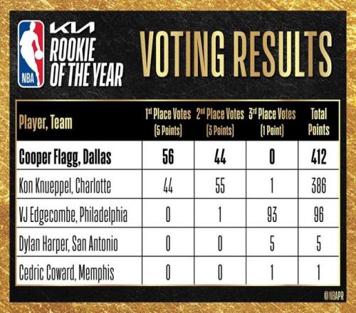 北京时间4月23日,在弗拉格成功当选2025-26赛季最佳新秀之后,NBA官方公布了此次评选的详细票数,弗拉格获得了56张第一选票,最终以总分412分力压黄蜂的克努佩尔成功当选。