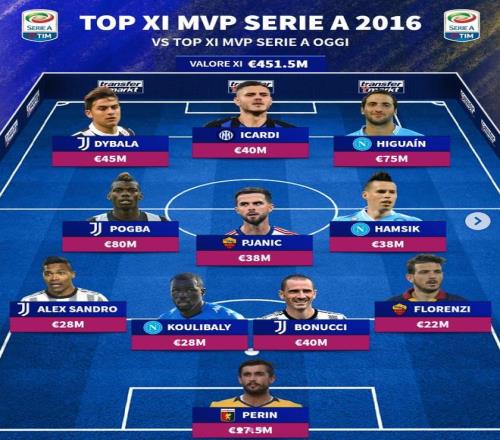 北京时间4月28日,德转回顾了意甲2016年的最贵11人阵容,并与目前意甲最贵的11人阵容进行了一次对比。